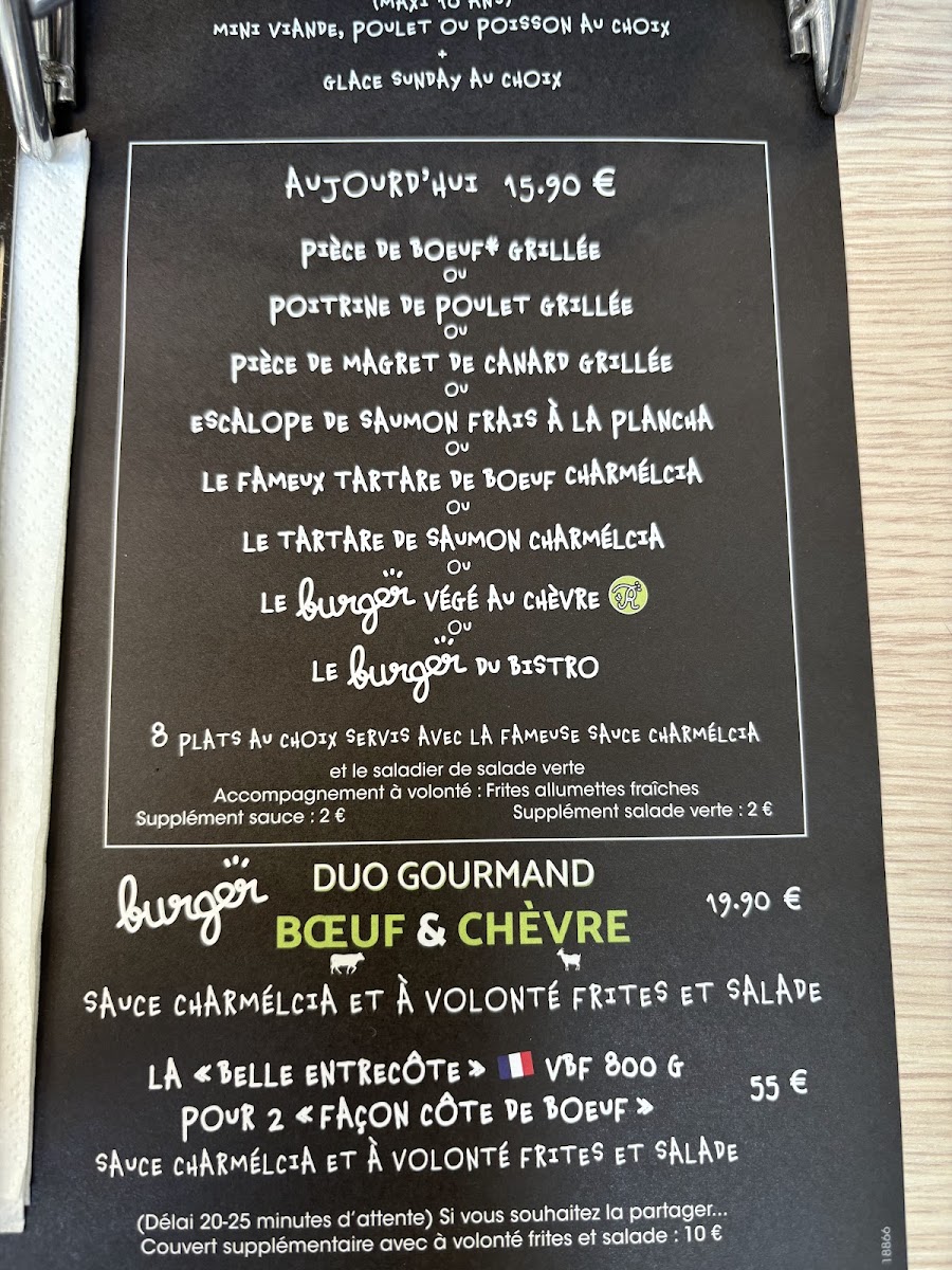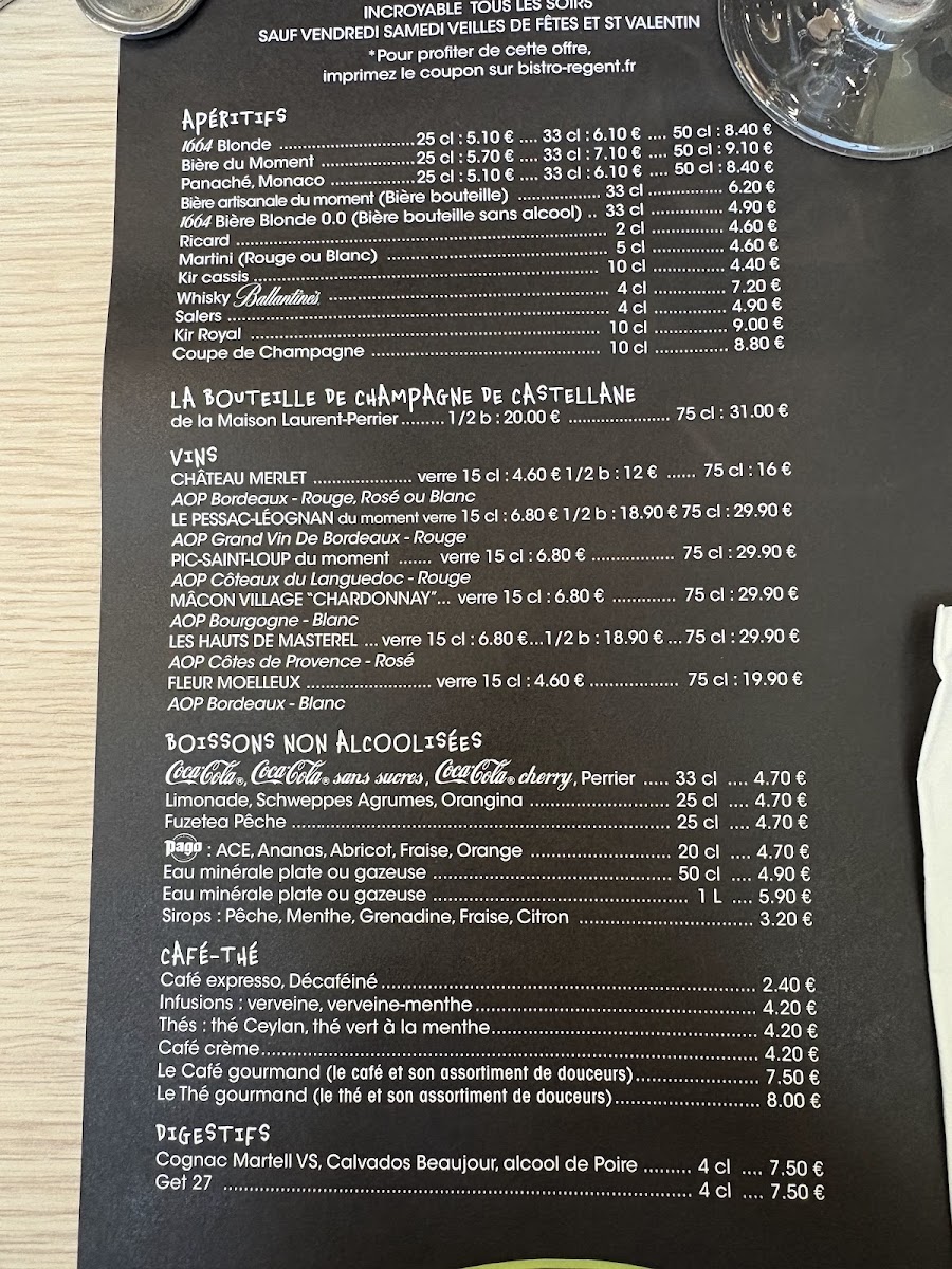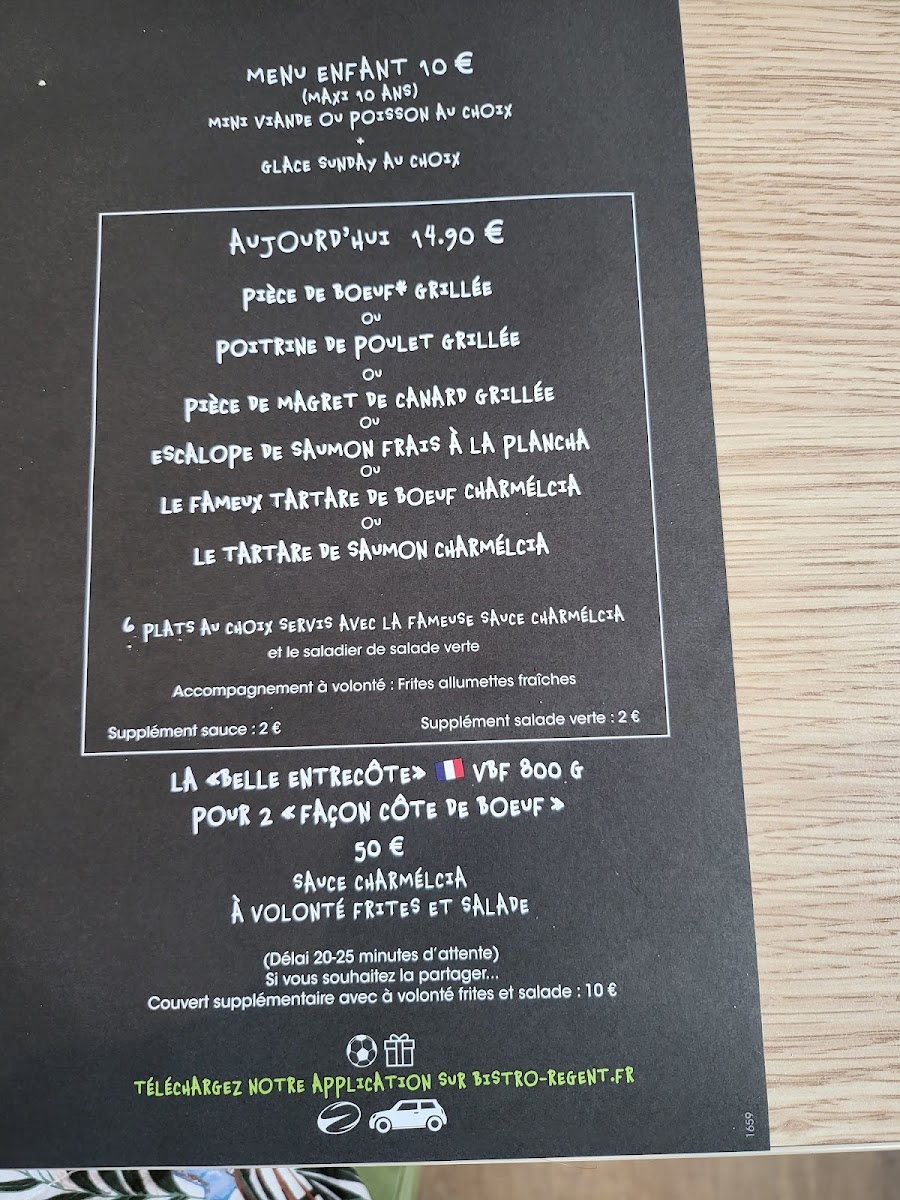 At Bistro Régent, simplicity is celebrated through a thoughtfully curated menu that emphasizes quality ingredients and classic flavors. Each dish is crafted with care, notably the Formule Unique at an attractive price of just €15.90. Here, you can savor a juicy piece of beef, grilled to perfection and accompanied by a fresh salad and homemade “frites allumettes” that are simply irresistible. Alternate options include the succulent magret de canard grillé and the light yet flavorful escalope de saumon frais, both served with the same delightful accompaniments. For those in search of a feast, the La belle entrecôte VBF offers an astounding 800 grams of rib steak, ideal for sharing—especially enhanced by the exquisite CHARMELCIA sauce that elevates the meat's natural flavors.